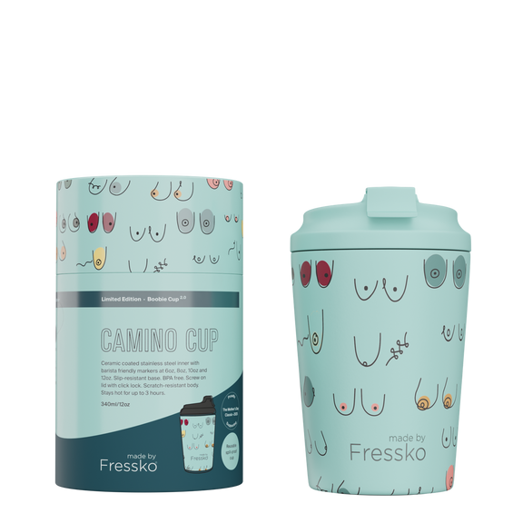 Sip sustainably and support a cause with the Camino Boobie Breezy cup. This limited edition 12oz reusable cup by Made by Fressko keeps your coffee hot for up to 3 hours while funding breast & ovarian cancer research.