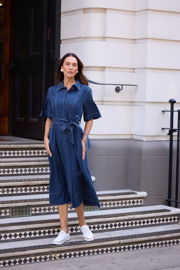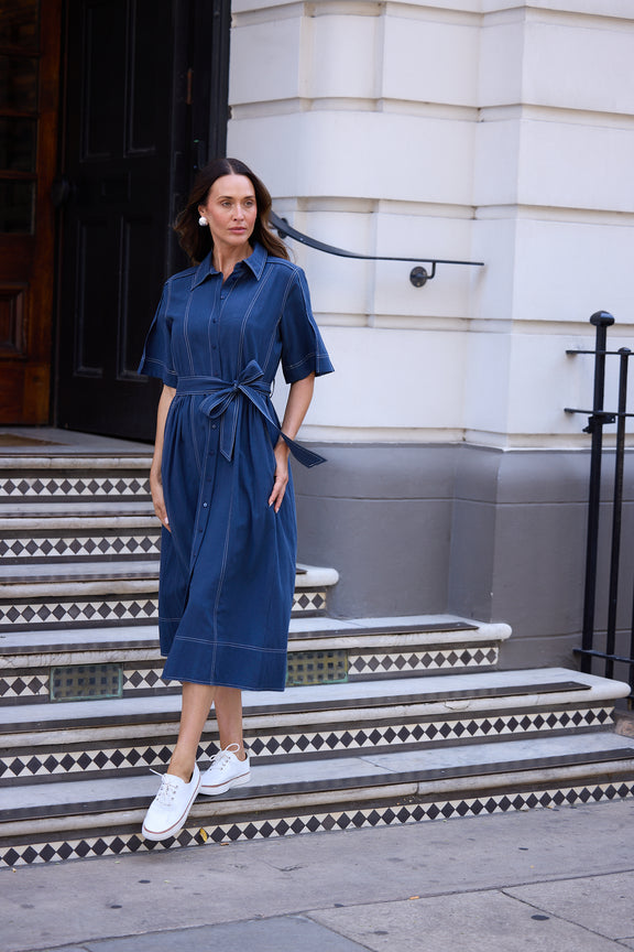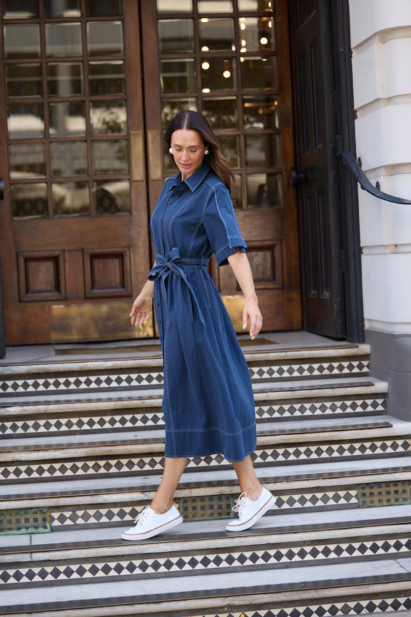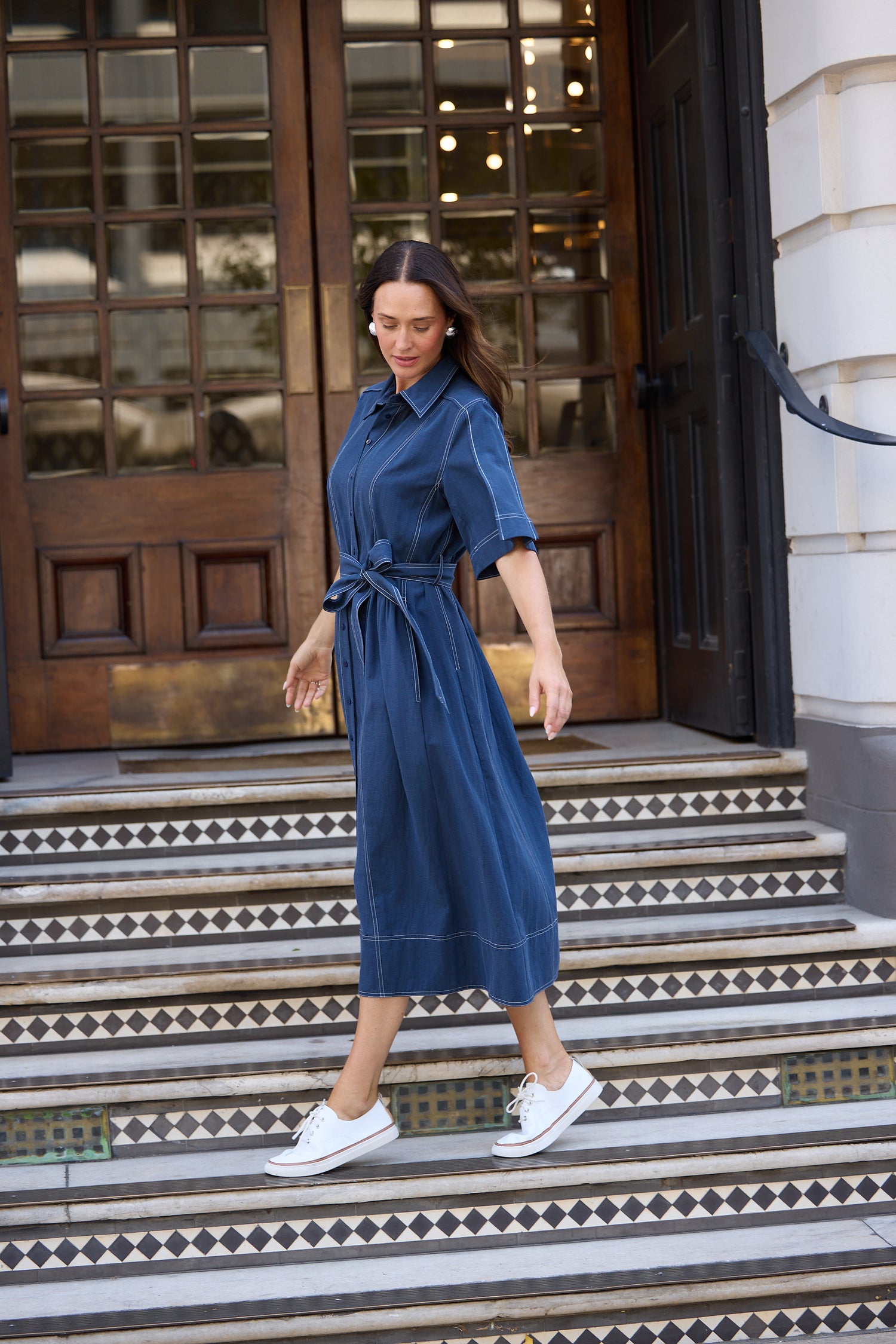 The Leo Dress in navy is a versatile, easy-to-wear piece designed for effortless style and comfort. Featuring a classic two-piece collar and front button-through closure, it brings a timeless feel with modern touches.