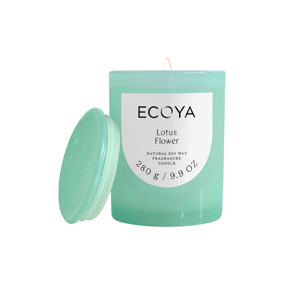 The original ECOYA candle. Housed in a translucent coloured glass vessel with a matching shield label, designed to complement the ECOYA Home Collection. Crafted from natural soy wax and blended with Ecoya's signature fragrances, the Metro Candle offers a refined and contemporary aesthetic. Sealed with a glass lid and providing a delicately scented burn time of up to 55 hours. 280g
