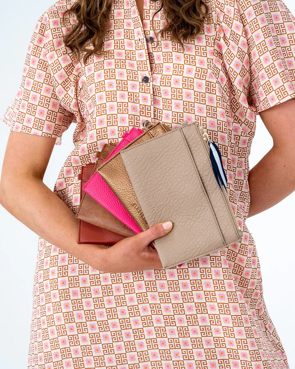 Introducing, New York Coin Purse. Made from premium polyurethane, with slim line construction. The coin purse features a front open top, slip pocket with a hidden magnetic closure. The centre compartment has a top zipper closure with an accent ribbon zipper pull.