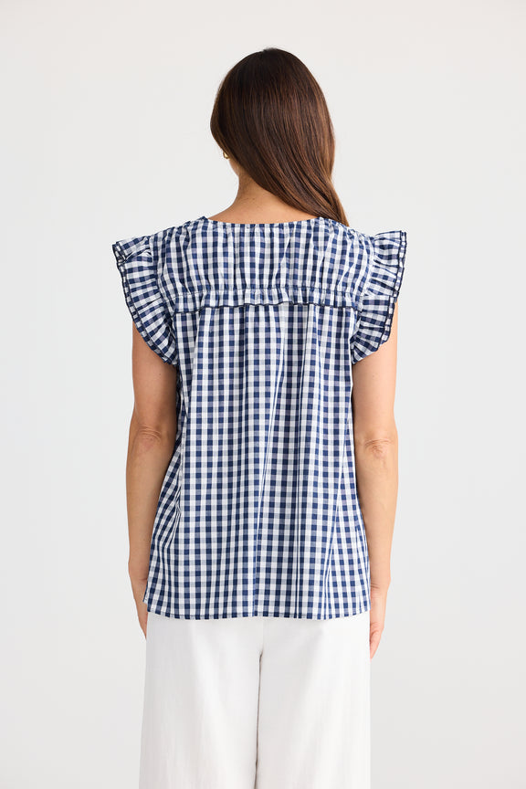 The Paz Top in Navy Gingham is a playful yet elegant cotton blouse with a flattering V-neckline, frill details, and a relaxed fit. Perfect for casual days or polished evenings.