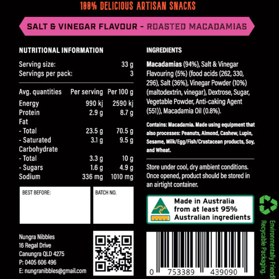 Prepare yourself for a flavour explosion with Nungra Nibbles Salt & Vinegar Roasted Macadamias! This delicious blend features Australian macadamias coated in a tantalizing mix of salt and vinegar that will leave your taste buds craving more.