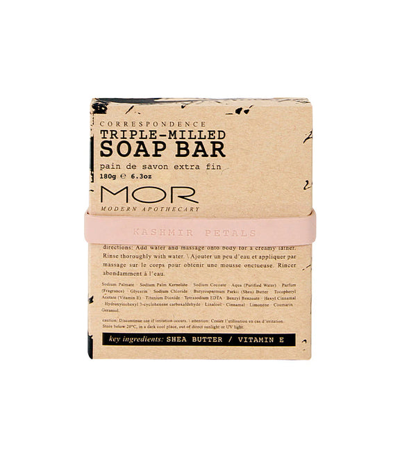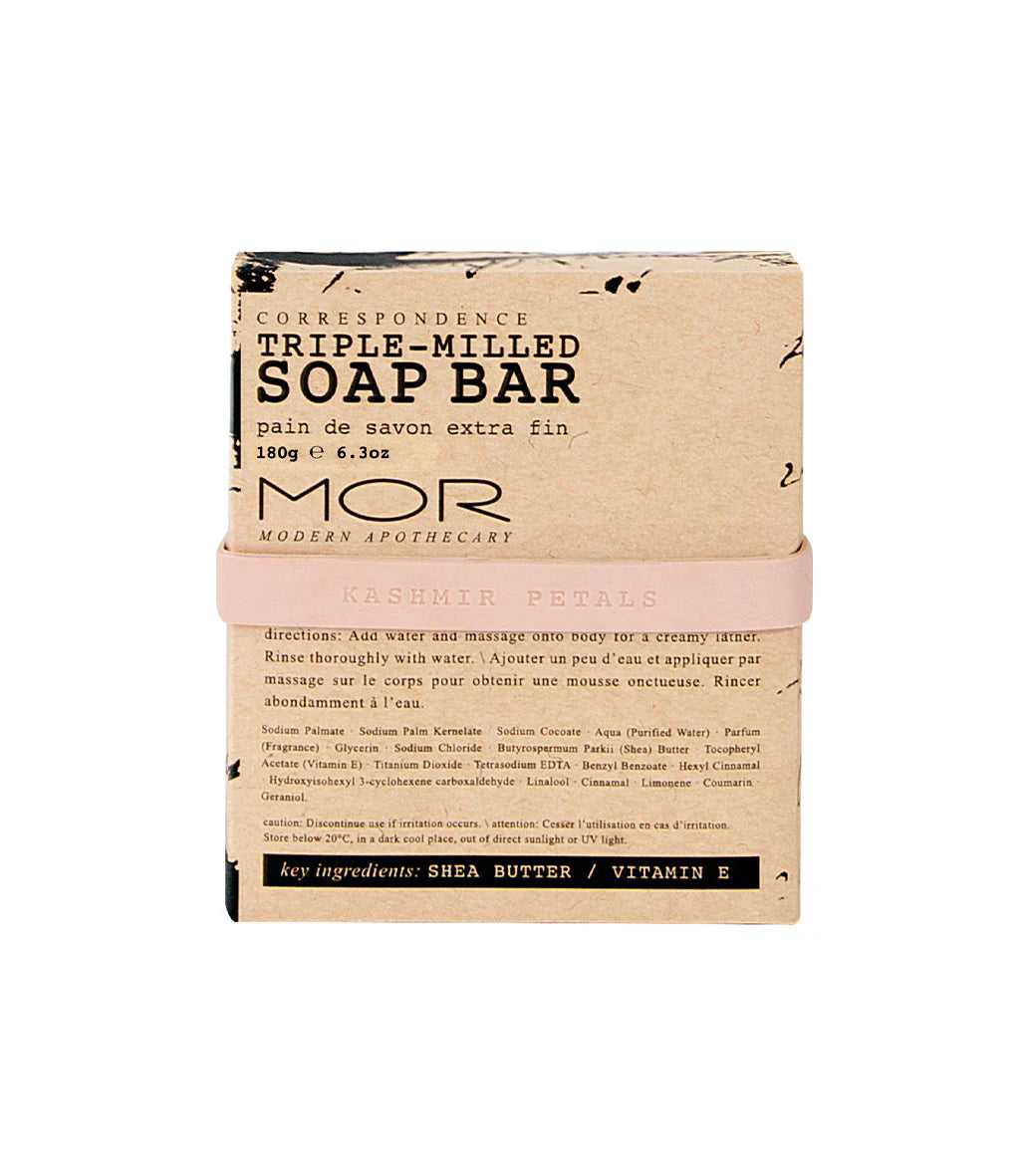 Indulge in the luxurious scent of Kashmir Petals with MOR’s Triple-Milled Soap Bar. Beautifully fragranced and enriched with Shea Butter and Vitamin E, this elegant soap gently cleanses while leaving skin feeling soft, smooth and delicately perfumed.